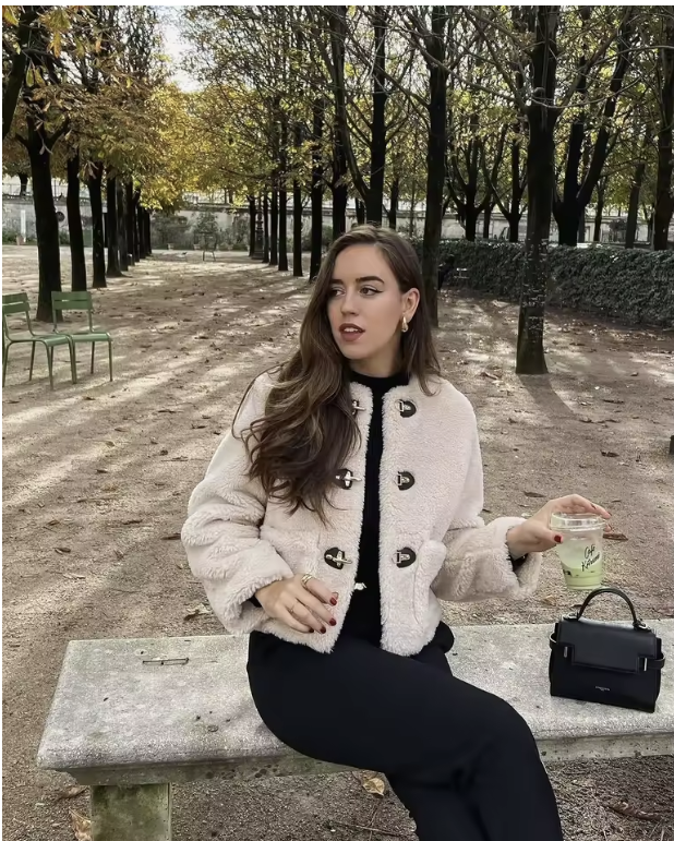 A cozy and stylish faux fur jacket for women, featuring a round neck, long sleeves, and a trendy double-sided knotted buckle. Perfect for fall and winter, this jacket combines warmth with chic, effortless style.